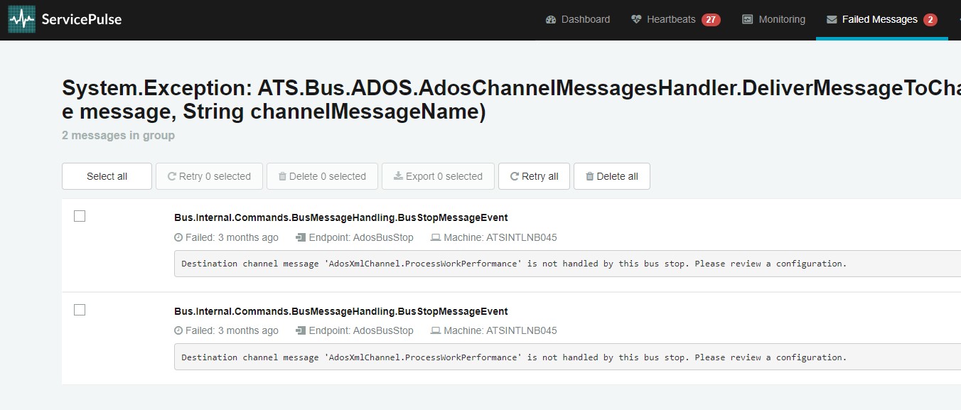 It might happen that ATS Bus is unable to deliver messages to a certain channel or endpoint because of an error. These messages are sent to the ServiceControl error queue and will appear as error messages in ServiceInsight. You can retry those messages if the configuration issue is resolved or you can export these messages to an excel file if retrying the messages is not an option.