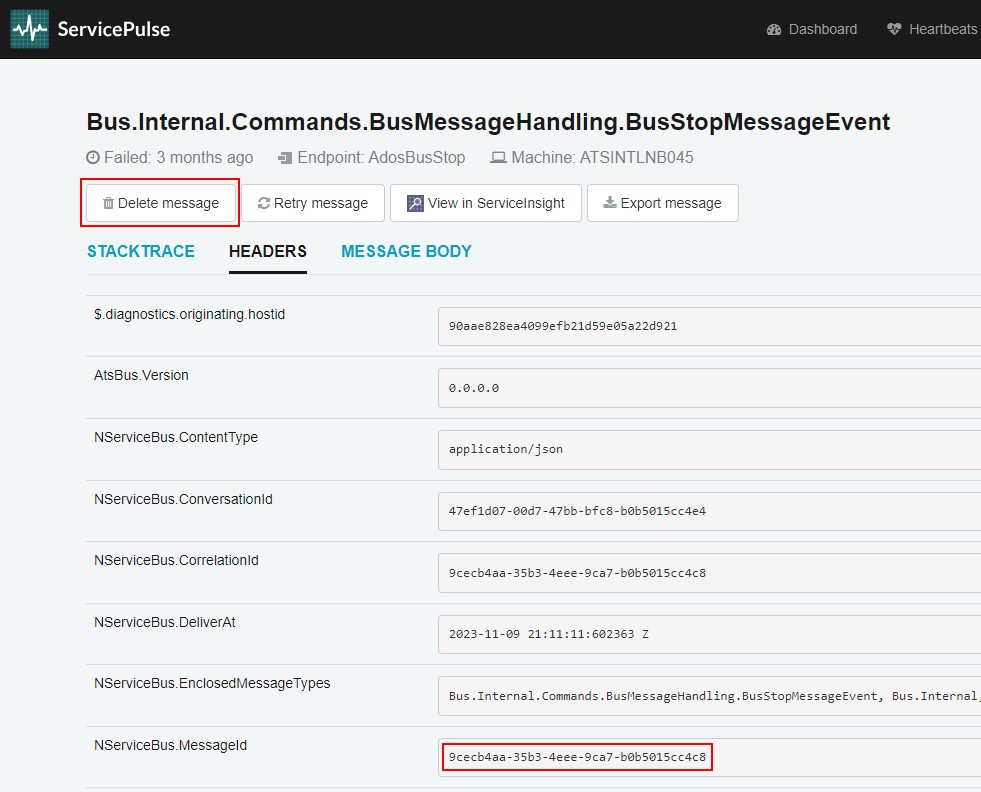 Clicking the delete button will delete the message with message ID '9cecb4aa-35b3-4eee-9ca7-b0b5015cc4c8'.