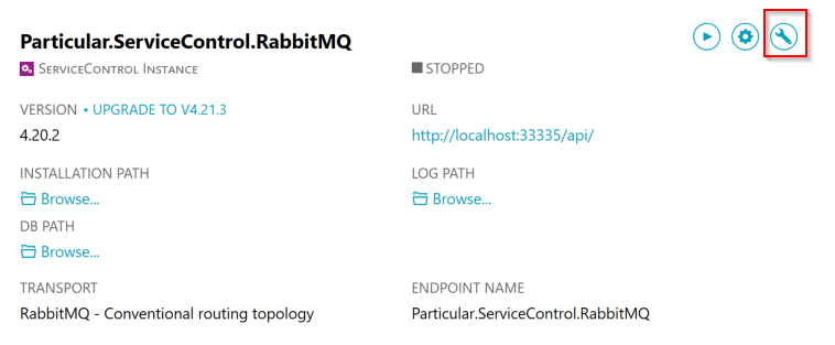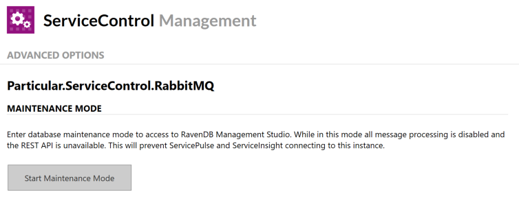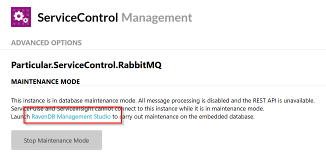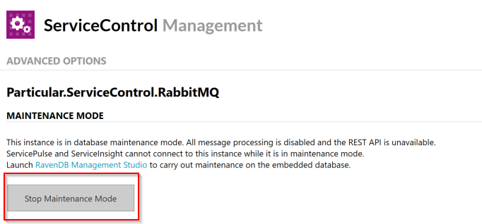 Once exported, return to the ServiceControl Management dialog and press Stop Maintenance Mode to run ServiceControl in normal mode again.
