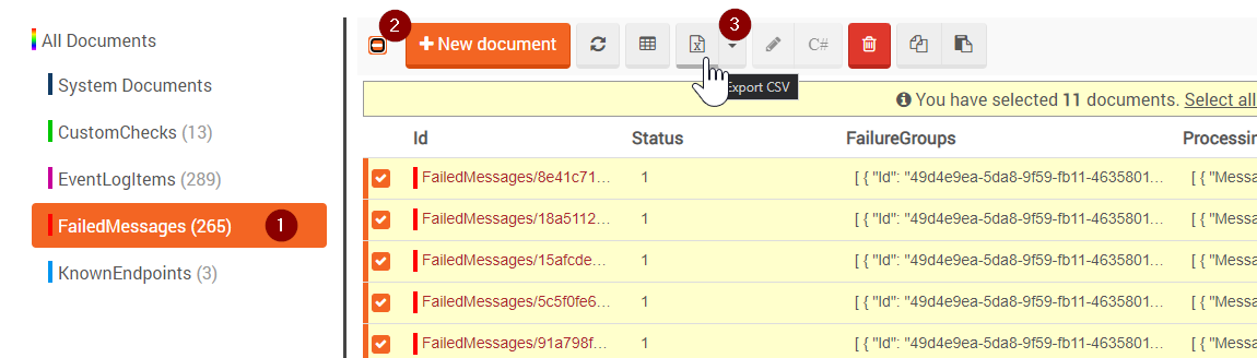 Select FailedMessages from the left hand menu (1), click on the checkbox on the left-hand side of the ‘+ New Document’ (2) button to select all messages and Export to CSV (3).