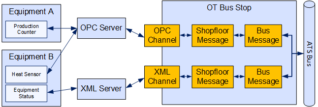 An OT Bus Stop allows data to be exchanged with equipment on the factory floor via an intermediary such as an OPC or XML server. The OT bus stop will listen out for messages on the Bus that correspond to the message type, operations and equipment that it's set up for. When it sees an appropriate message it passes the relevant information down to the equipment.