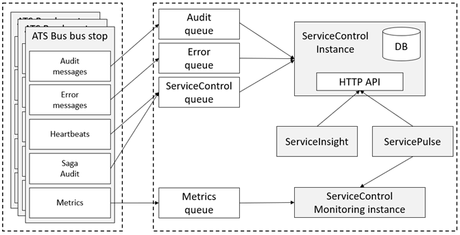 The ServiceControl instance consumes from the audit, error and ServiceControl queue and stores the data in an internal database. The Monitoring instance consumes from the metrics queue and stores the data in an internal buffer for ten minutes. Both the ServiceControl and Monitoring instance expose their information via an HTTP API.