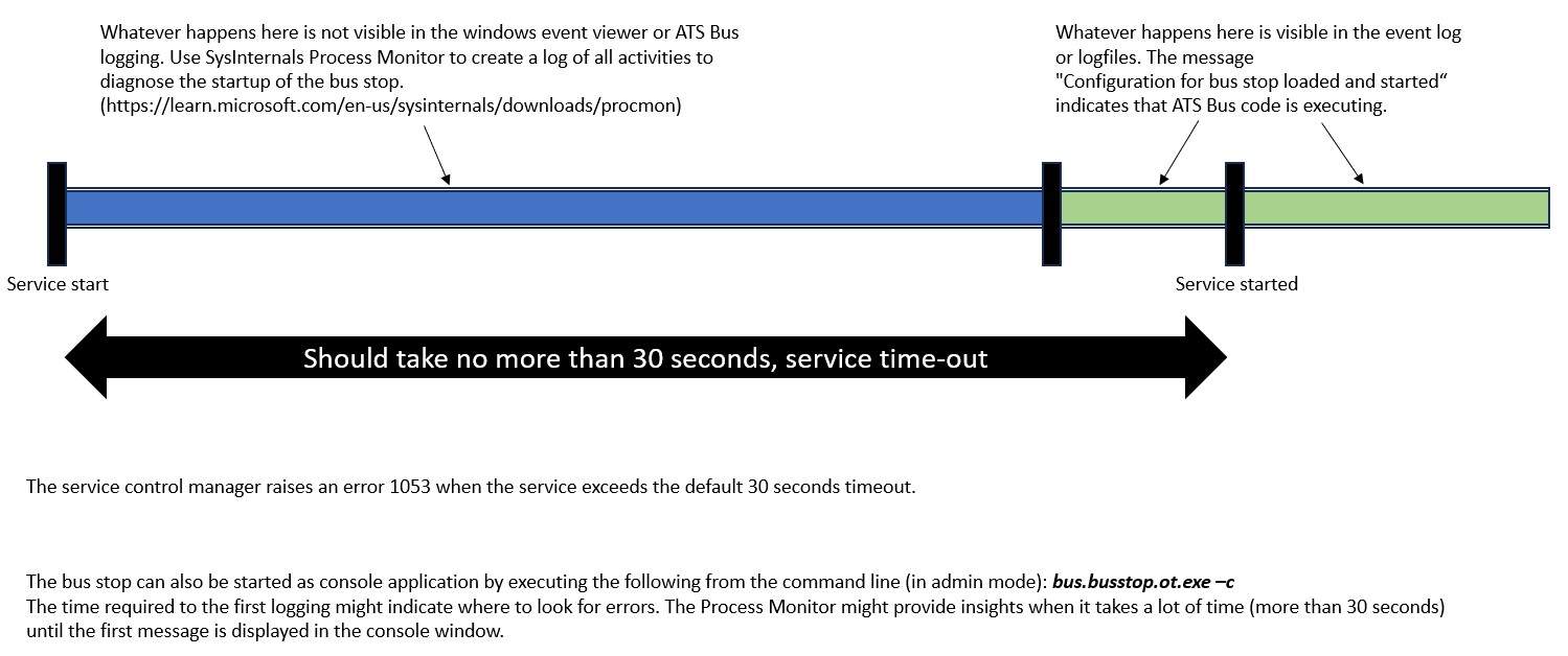 It is important to understand that the operating system and the .NET runtime also influence the startup of the ATS Bus service/application and that their involvement is only visible using tools like the SysInternals Process Monitor. When starting the service, time is required to setup operating system and .NET runtime specific items, and is indicated by the blue line in the diagram below. At a certain point, the ATS Bus service / application is able to log to log files or the event log and this is indicated by the green line. The diagram below shows that not everything is logged by the ATS Bus application and service.