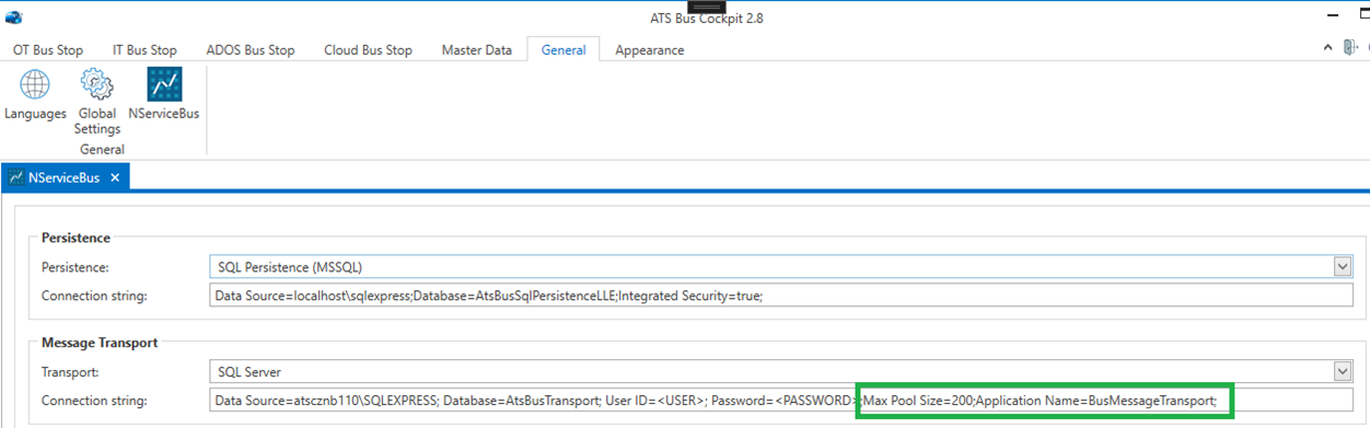 The poolsize for each connectionstring is set to 100 connections. 100 connections does not mean 100 bus messages but 50 because the other 50 are used to transport audit messages. The connection pool size can be increased to cover for a message burst. Updating the connection pool size is done by modifying the ‘Max Pool Size’ argument in the connection string. (See screenshot below for an example).