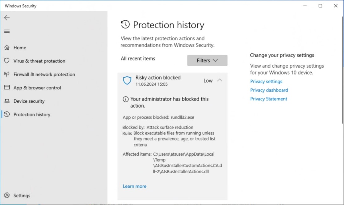 While installing ATS Bus, a notification that a risky action was blocked may appear in the notification bar. The Protection history in the Windows Security application shows that a custom installer action was blocked by the Attack surface reduction.