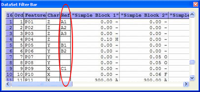 In the CM4Di DataSet Grid, a column titled “Ref” can be displayed that contains the result of the ~align, isdatum~ variable: