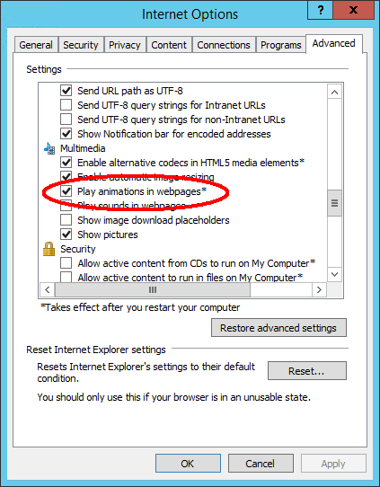 If you are viewing the GIFs using Internet Explorer, but the images are not animated, check that the following setting is enabled: Internet Options > Advanced > Multimedia > Play animations in webpages*