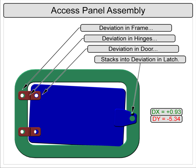 For the Access Panel Assembly scenario shown in the image below, one goal is to predict the deviation measurement between a point on the latch of a door and a point on the frame. The challenge of performing this calculation is that these two points are influenced throughout the assembly process by the deviations of the different components of the access panel assembly.