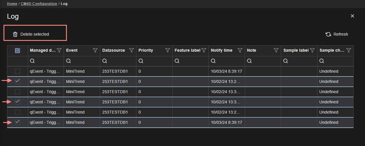 To selectively choose logs to delete, check the box(es) for each row you want to remove, then click Delete Selected.