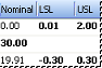 The nominal and limit columns will reflect the date chosen in the Active Effective Date menu. Values that are in grayed font (e.g. -0.30) represent the "Bleed Through" values, or those that have been carried over from somewhere else (i.e. an older effective date). Those values that are not gray (e.g. 19.91) indicate that the value "Has Active Effective Date", or that it had been changed at the exact time of the process baseline date selected in the Active Effective Date menu.