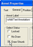In the Annot Properties dialog, select the Draw Shrunk check box on the General tab to designate the offspring annotation as the shrunk version of the annotation.