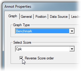 In the Graph properties, you need to select a Score for the Benchmark. Scores are useful in areas where data needs to be converted to a score, grade, or tally. Scores can be used for CM4D DataStack evaluation operations such as the Score and Benchmark operations. Scores are also used to apply table and chart styles and to create benchmark graphs.