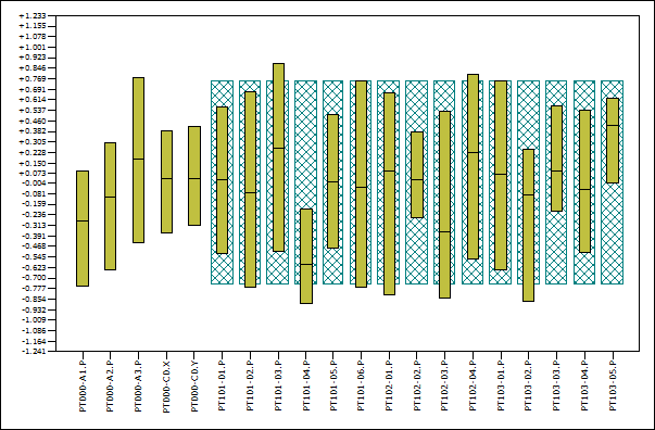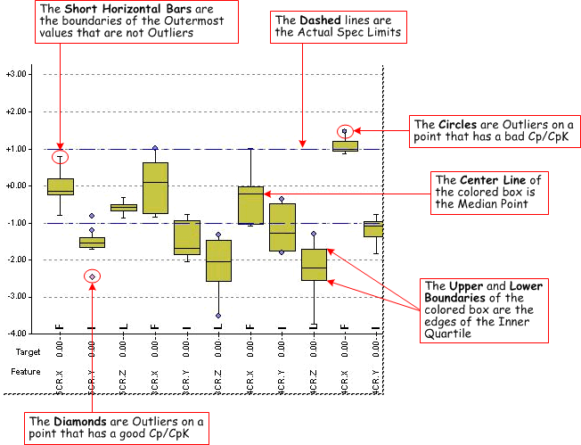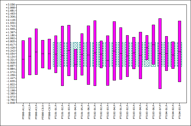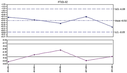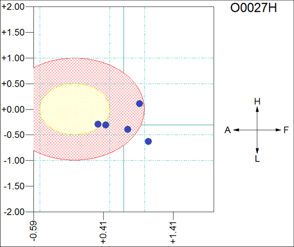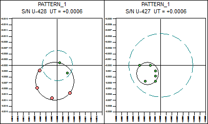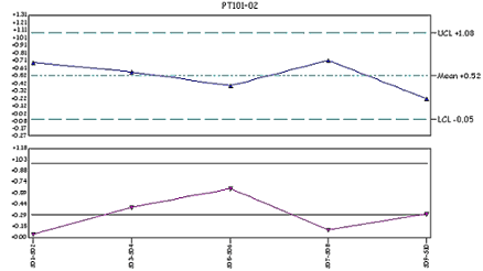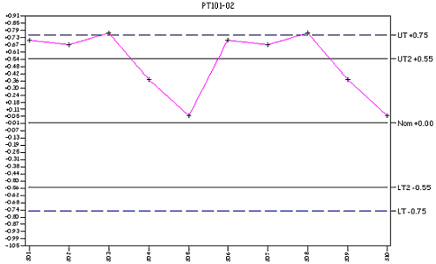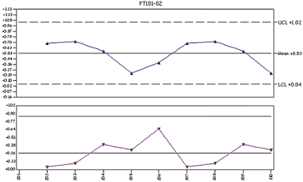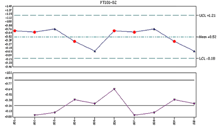 What is called a Target graph in CM4D is sometimes referred to as a Scatter Diagram or Scatter Plot in general SPC terminology. Target charts plot variables on both axes, rather than only one axis (like with a Trend chart). Limit lines are displayed as circles around the points. Styles of limit lines and markers can be edited like any other chart.