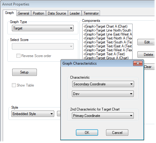 When setting up the Graph properties for a Target, you have to specify two variables for the Graph Characteristics in the Setup dialog. Select the first characteristic for the vertical axis and the 2nd for the horizontal axis.