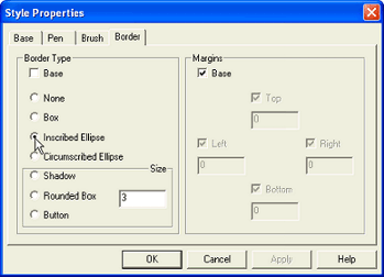 Within the View tab of the Annot Properties dialog box, click the Setup button, and then click the Border tab in the Style Properties dialog. Uncheck the Base check box and select Inscribed Ellipse. On the Pen tab, uncheck the Base check boxes for Color and Size, then select Red from the Color menu and enter 1.5 in the Size field. Click OK twice to return to the user interface.