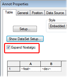 A fix made to tables in v20.2 changed how Table annotation using variables resolved when subsets of DataSet rows are used as the DataSource. To support the migration of existing tables, a new option has been added to the Table annot properties called Expand Nostalgic. What this means is that tables with the Expand Nostalgic property turned on will expand in the same way as seen in older versions.
