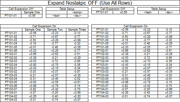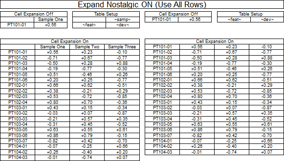 Tables that have Expand Features and/or Samples turned on (in the Cell Properties), or tables that Use All Rows from the DataSet, will not appear any differently than in previous versions. They will appear the same whether the new Expand Nostalgic is turned on or not.