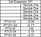 For example, a table set up to load rows 1 through 5 from the DataSet and did not use Expansion of Features and/or Samples (at the Cell Property level) would produce something like the following: