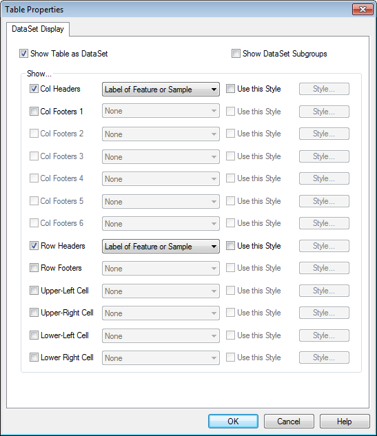 The Show... options will be grayed out (disabled) until you check the Show Table as DataSet box. Check the boxes next to the table options you want to show, then select a display option from the available dropdown menus to the right.