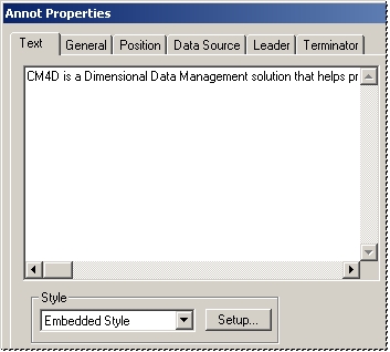 Modify a text annotation’s visual properties by pressing the Setup button. Text Style properties allow you to control text properties such as color, font, orientation, and a variety of other visual attributes. See the topic Style Properties for more information.