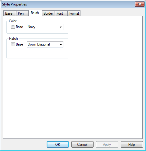 The Hatch property is used to select a brush hatching style rather than an opaque brush color. Check the Base checkbox to select the base style’s hatch style, or deselect it to override the base style.