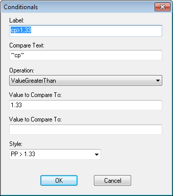 To Edit a Condition, select it in the main Condition pane and then click Edit. In the Conditionals dialog, you can set your conditions for triggering a style. CM4D determines the order of the values in the "Value to Compare To" fields when they are resolved.