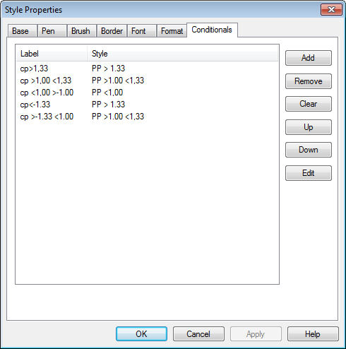 Conditional Styles are used when you want to indicate on a single annotation when an event is triggered, whether Tolerance 1, Tolerance 2, or Both have been triggered. A Conditional Style can set up an ordered list of events, similar to DataSet events, but they are not part of a DataSet. These styles allow for multiple conditions within a single style setting. When a conditional style is referenced in an annotation, each of the events is considered when determining what style to use for the annotation. The styles build on each other, so if the first event triggers and sets the font to red and the second event triggers and sets the font to underlined, then the final style for the text font would be red and underlined.