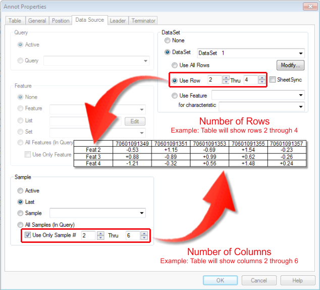 For Table annotation, the number of Columns can be specified, similar to how you set the number of Rows. When working with tables that contain a large number of columns, selecting which columns appear on a sheet allows you to create a table of information that spans multiple sheets. To load a set number of Last Samples, enter negative numbers in the Sample # fields.
