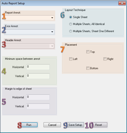 If you are using the layout technique, Multiple Sheets, First Sheet Different, the Placement indicates the direction from which the AutoReport will be run from the header annotation. For example, if you want to run the annotations downward on the sheet from the header annot, you should set the Placement to 'Bottom". If you want the annotation to run to the right of the header annot, set the Placement to "Right".