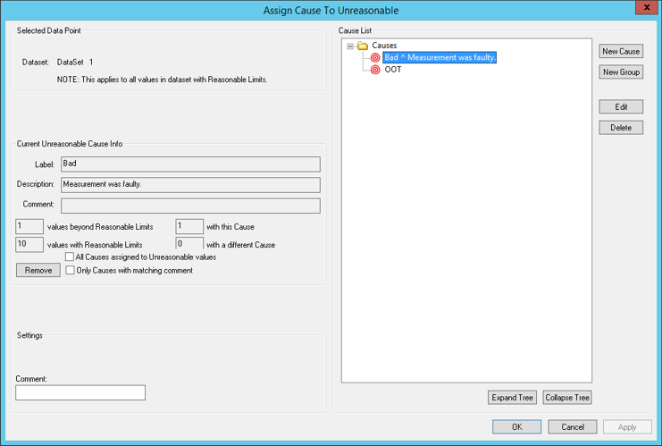 The Assign Cause to Unreasonable dialog contains settings for assigning causes to data that exceeds the reasonable limits. When you assign a cause using this dialog, the cause will be assigned to all values in the DataSet which exceed your reasonable limits. For more information about causes, see the topic Assign Cause. For Information about reasonable limits see the topic Reasonable Limits.
