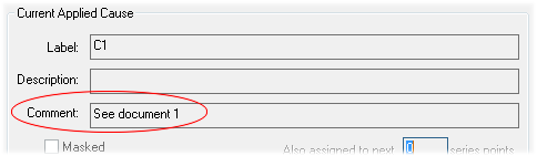 Cause Comments can be used in addition to Cause Labels to customize the display of marked data when a cause has been assigned. Comments can be added to a single point or to a series of consecutive points. To assign a comment, select a cause label from the list of available labels or create a new cause label, then enter a Comment in the Settings region of the Assign Cause dialog. Select the Also assign to next __ series points check box to assign identical comments to a series of consecutive points.