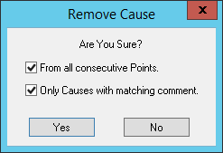 When you choose to remove a cause, a dialog will appear to confirm removal along with two choices: To remove a cause (1) From all consecutive Points, or (2) Only Causes with matching comments From all consecutive Points. The Only Causes with matching comments option will be disabled unless the consecutive points check box is selected.
