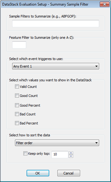 The Summary Sample Filter DataStack Evaluation type is intended for use with the Summary Sample Filter Report builder. See the topic Summary Sample Filter Reports for information on how to create reports that use this DataStack evaluation.
