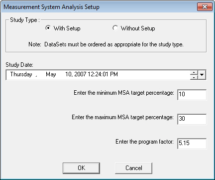 The Evaluation menu on the DataSet Properties DataSource tab is one way Measurement System Analysis Setup can be accessed. MSA Setup can also be accessed by opening the Feature Editor and double clicking the MSAs folder to open the Create or Edit MSA dialog, or by clicking the MSA button on the toolbar to open the MSA Wizard.