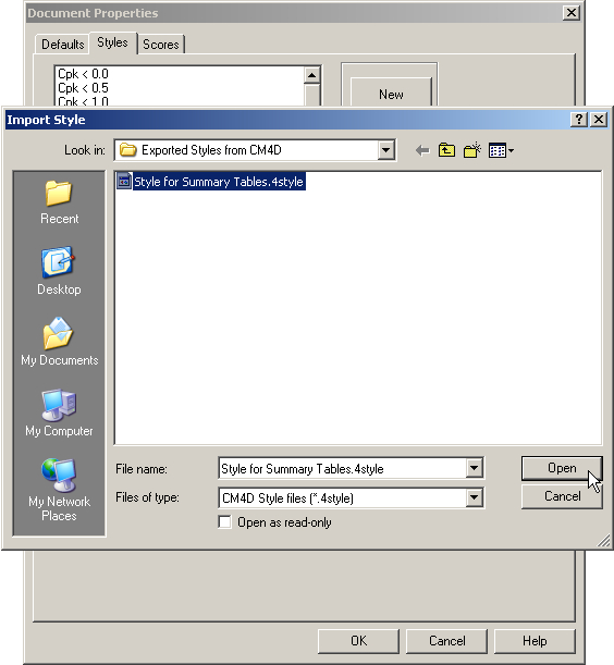 Import a user-created style to your document. The imported styles require a file with a *.4style extension which may be located in any user-accessible folder. When the same style is imported more than once, the label "Import n" is automatically added to the end of the duplicate style label (where n is an automatically sequenced number). The Import function may be used when common styles need to be shared from template to template. The style and all included properties will be exported as a ".4style" file, which may then be imported into a new template through the Document Properties Styles tab. |
