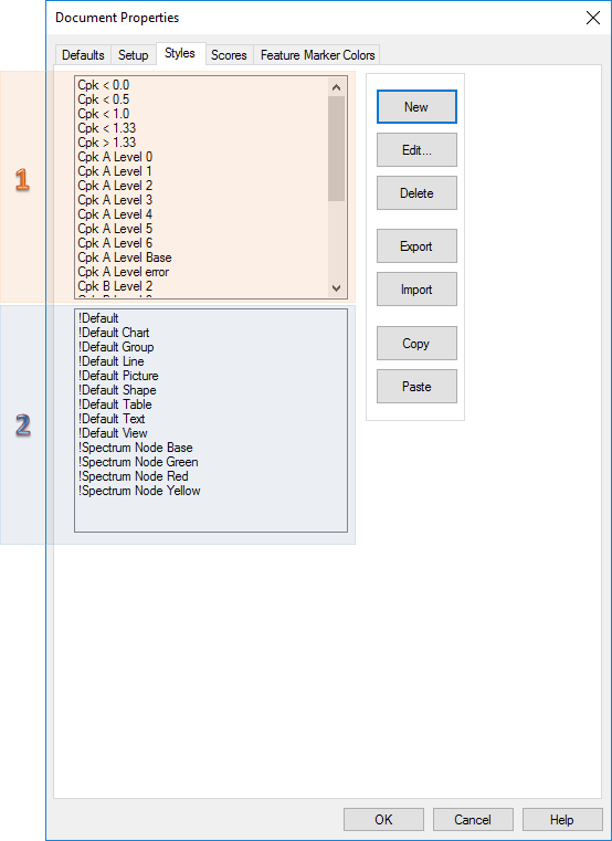 Paste a copied style from the clipboard into the same document or into another document. When the same style is pasted more than once, the label "Paste n" is automatically added to the end of the duplicate style label. There may be some styles that appear in the top region on the Styles dialog. These two styles are examples that are created by CM4D when the Build Examples button is clicked in the Scores tab of the Document Defaults dialog. See the topic Document Properties - Scores Tab for more information. |