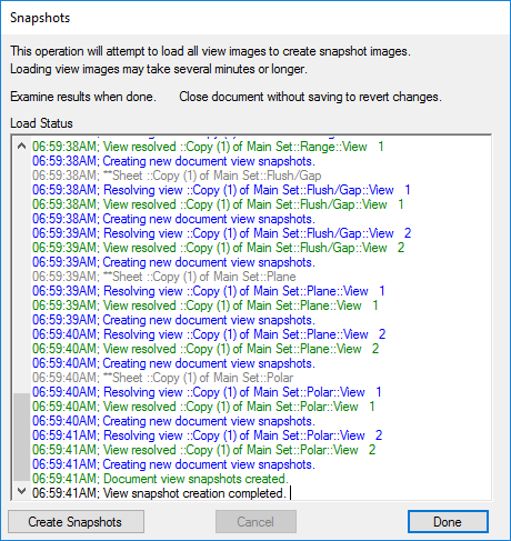 A manual update may be warranted if there has been a change to the stored CAD file, Document Feature Marker Colors, or Resolution quality settings. Clicking Create/Update Snapshots initiates a full document refresh. Without using this button, views are updated on an individual basis at the time when a view is manipulated manually in any way within the document.