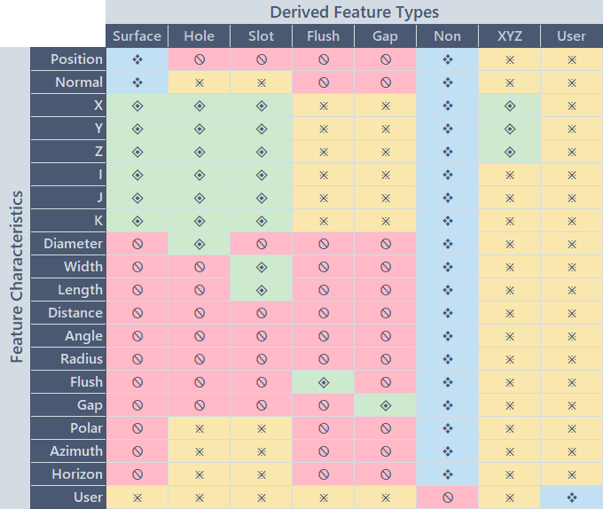 A Characteristic represents a measurable dimension or parameter of a feature such as a nominal X value, or an actual Y value. A characteristic might be associated to many features. Having created feature and characteristic definitions, many different feature types can be defined to identify and extract data from a wide variety of file formats. A feature such as a point will generally have XYZ and IJK nominal data. A hole, however, will also have a diameter. See the matrix below to see which characteristics make up each feature type.