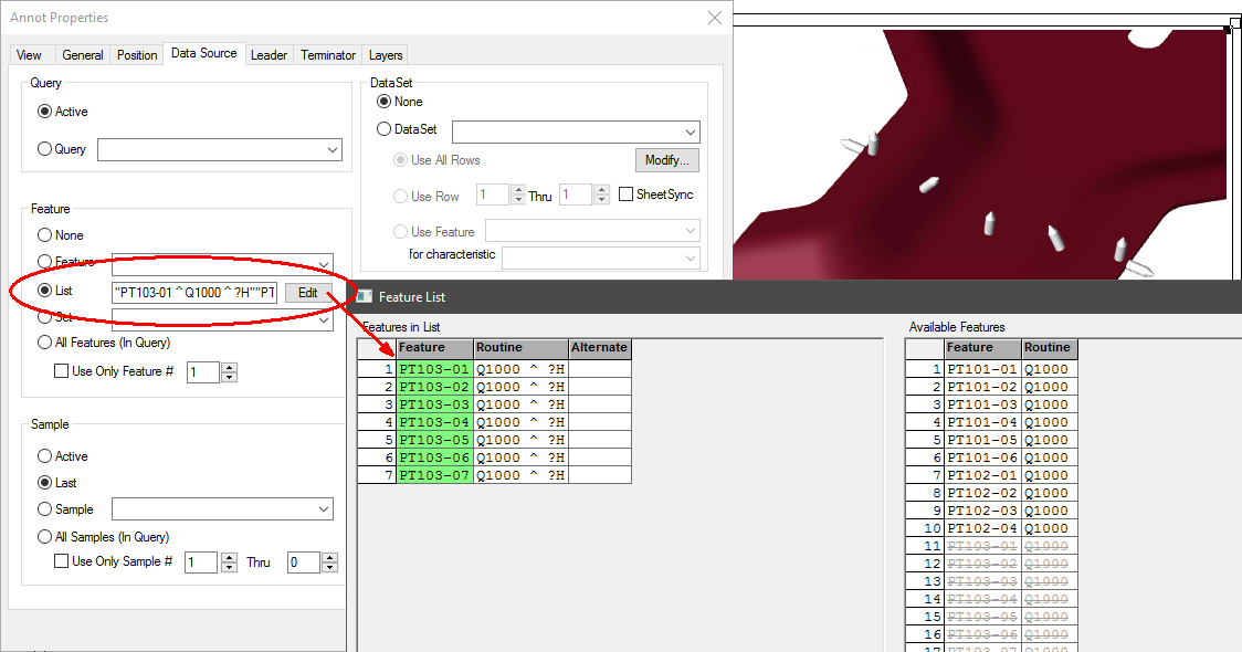 Any Features selected are added to a temporary list which can then be assigned as a DataSource, a Reference Feature or a Subroutine.