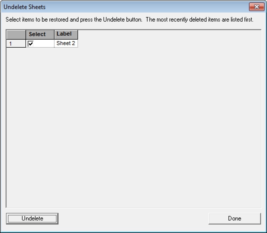 - In the Undelete Sheets dialog, select the check boxes next to the Sheet labels that you want to restore to your document.