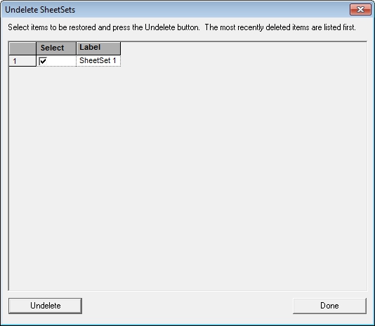 - In the Undelete SheetSets dialog, select the check boxes next to the SheetSet labels that you want to restore to your document.