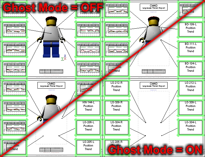 Shows annot in Ghost form, i.e., only text (DataSet row or Feature Label and Characteristic, and DataSet label) and view outlines are displayed. In this mode, reports are drawn faster when there are numerous sheets and annot in the SheetSet. It also allows for quick navigation and layout of your documents.