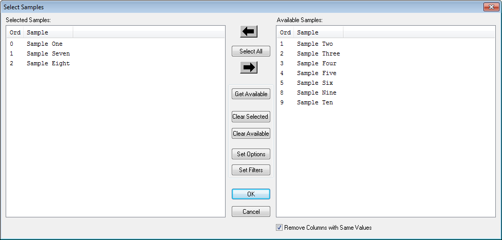 - Select All - moves all Available Samples over to the Selected Samples area