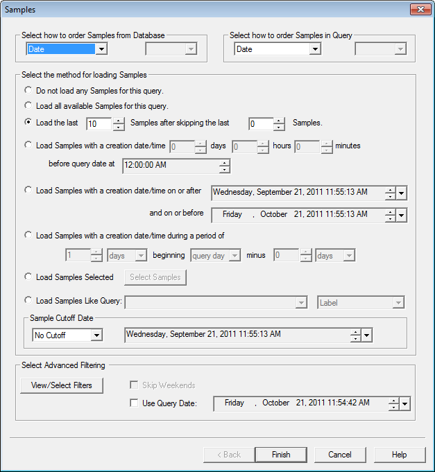 The Samples dialog is used for loading samples into a query. The options for loading samples are very flexible and many methods of choosing samples are provided. The Samples dialog can also be used to edit or update the sample load options for a query. To open the samples dialog, expand a query in the Tree bar, right click on the Samples folder, and select Properties from the menu. After selecting the desired load options, click the View/Select Filters button in the Select Advanced Filtering region to filter you samples to get only the samples you desire to see.