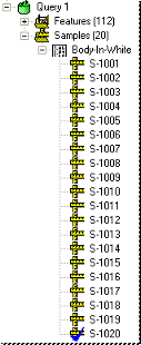 A sample represents actual values for one or more features. Typically, a sample will encompass the actual values collected for a single item. A sample can include actual values for one or more of the characteristics of a Feature. Samples have descriptive properties such as creation date/time, file name, etc. Sample data can be viewed in the info bar, or by expanding the data tree's samples node.