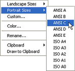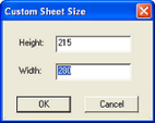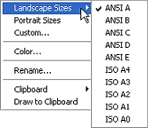To modify the current sheet size, right click the edge of the page you want changed. Highlight the paper orientation (landscape or portrait) you desire, then choose your desired paper size from the menu. If you prefer a custom size page, click Custom and enter dimensions for sheet size in the Custom Sheet Size dialog.
