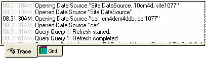 The information bar has two tabs. The first is the Trace tab. It displays information about all the actions which CM4D has taken to accomplish displaying or creating a document. This will list where and when files were retrieved, refreshed, etc.