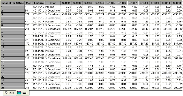 For example, when using Single Sift Rules, only "X's for Holes" may be shown. However, using Multiple Sift Rules allows you to set conditions such as, "show all X's for Holes, but first show all Y values <200, then all Y values [ (less than or equal to) 400." With conditions set, the grid will show all available points that match that criteria in black text. Rows that contain characteristics that do not match set criteria will appear gray, indicating inactive rows in the DataSet. These gray rows are characteristics that are available (the data does exist), but will not be used in annotation because those characteristics do not meet the Multi Sift criteria.