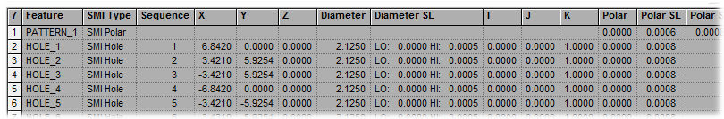 From the DataSource tab of the tree bar, right-click on Features and select View Features in Grid from the menu. This will display a single row in the grid for every feature in the selected routine. All available nominal information about the features will appear in the same row, including the feature label, aliases, SMI feature type, nominals, and tolerances.