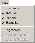 The View menu contains options for customizing the CM4D User Interface. Selecting Tree Bar, Info Bar, or Status Bar from the list will toggle them on and off.